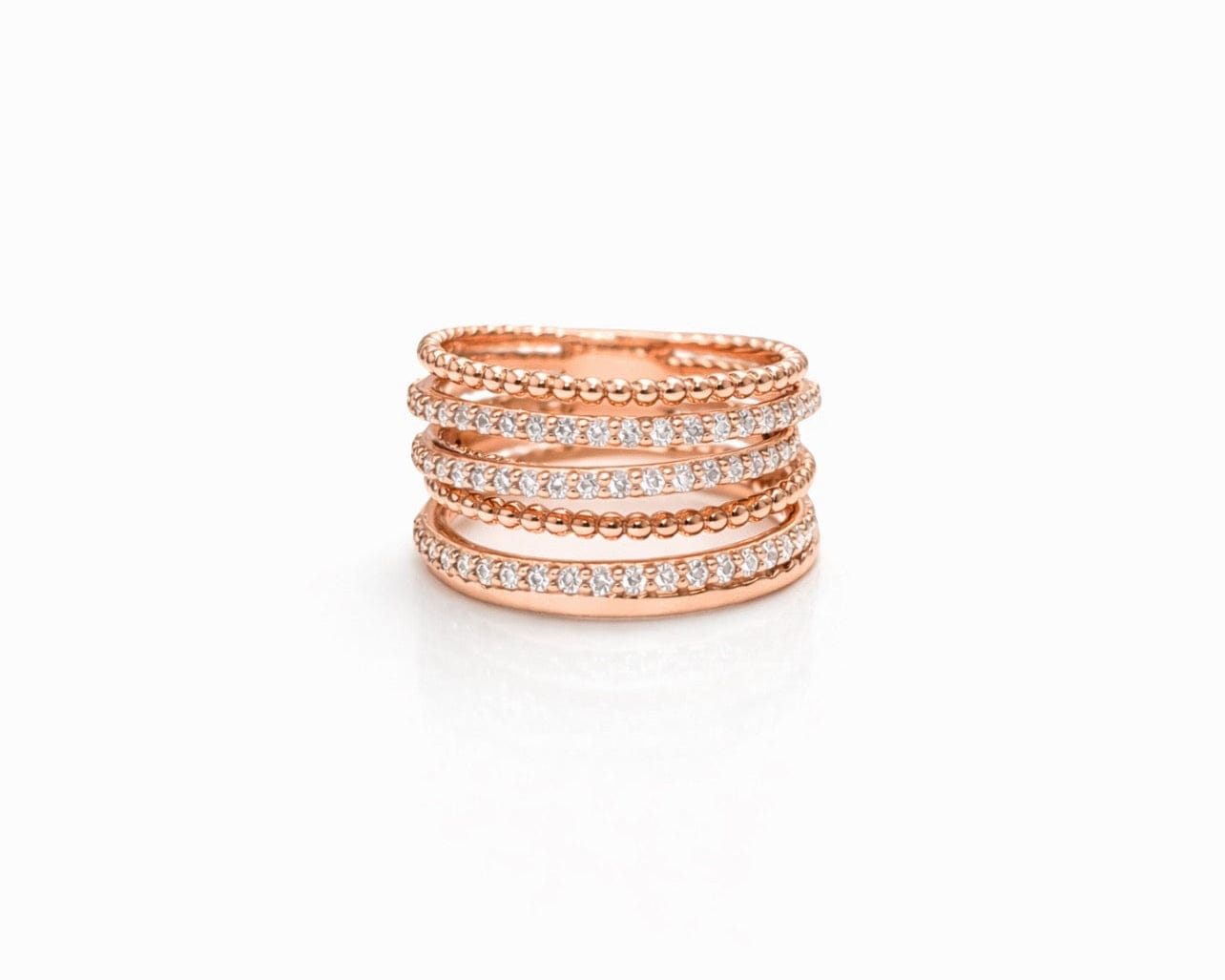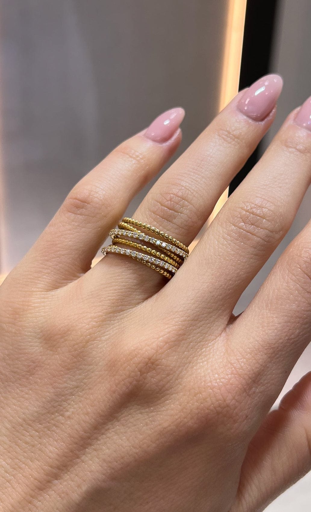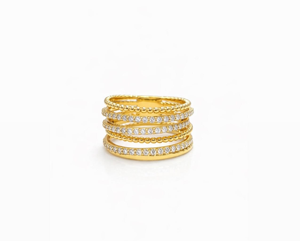 The interplay between smooth gold spheres and sparkling diamonds creates a light, textured look that catches the eye from every angle. Its stacked appearance gives the illusion of multiple rings in one, making it the perfect statement piece for everyday luxury or special occasions.