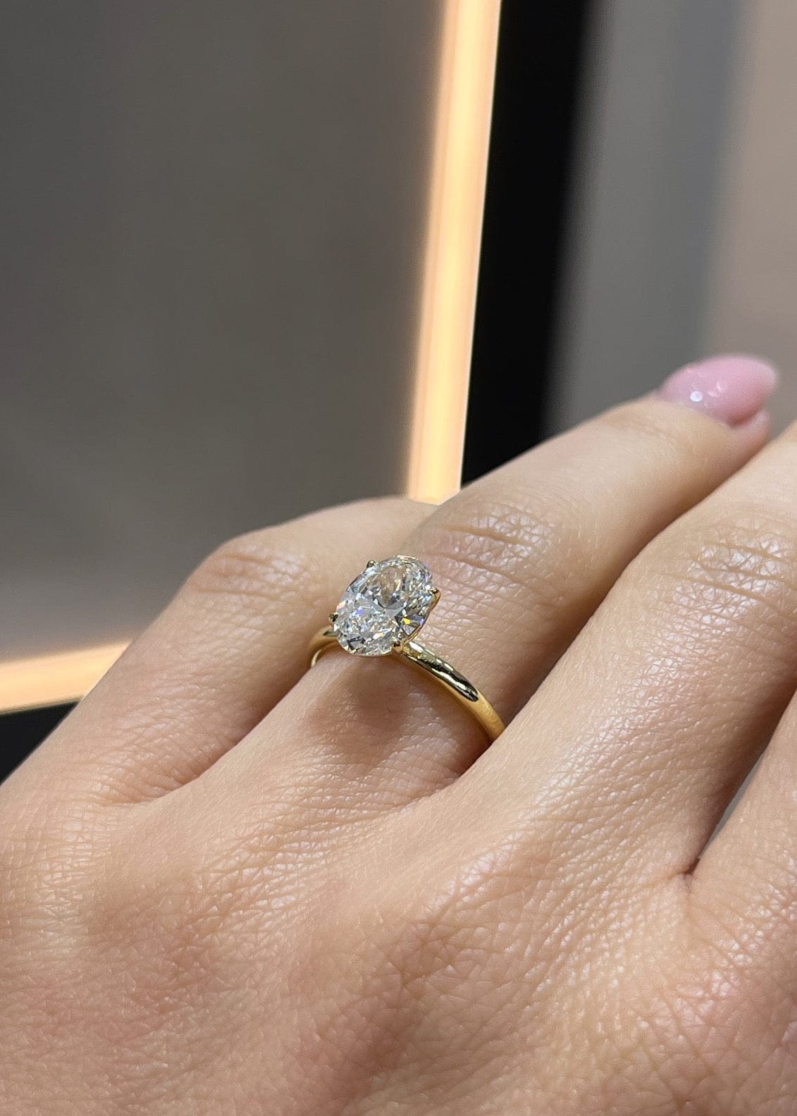 An oval-cut diamond solitaire ring set on a slim yellow gold band. The center stone is held in a classic four-prong setting, allowing maximum light to enhance its brilliance and sparkle. The band is smooth and polished with a minimalist profile, creating a timeless and refined look that emphasizes the size and clarity of the oval diamond. The overall style is elegant, modern, and perfect for an engagement or statement ring.