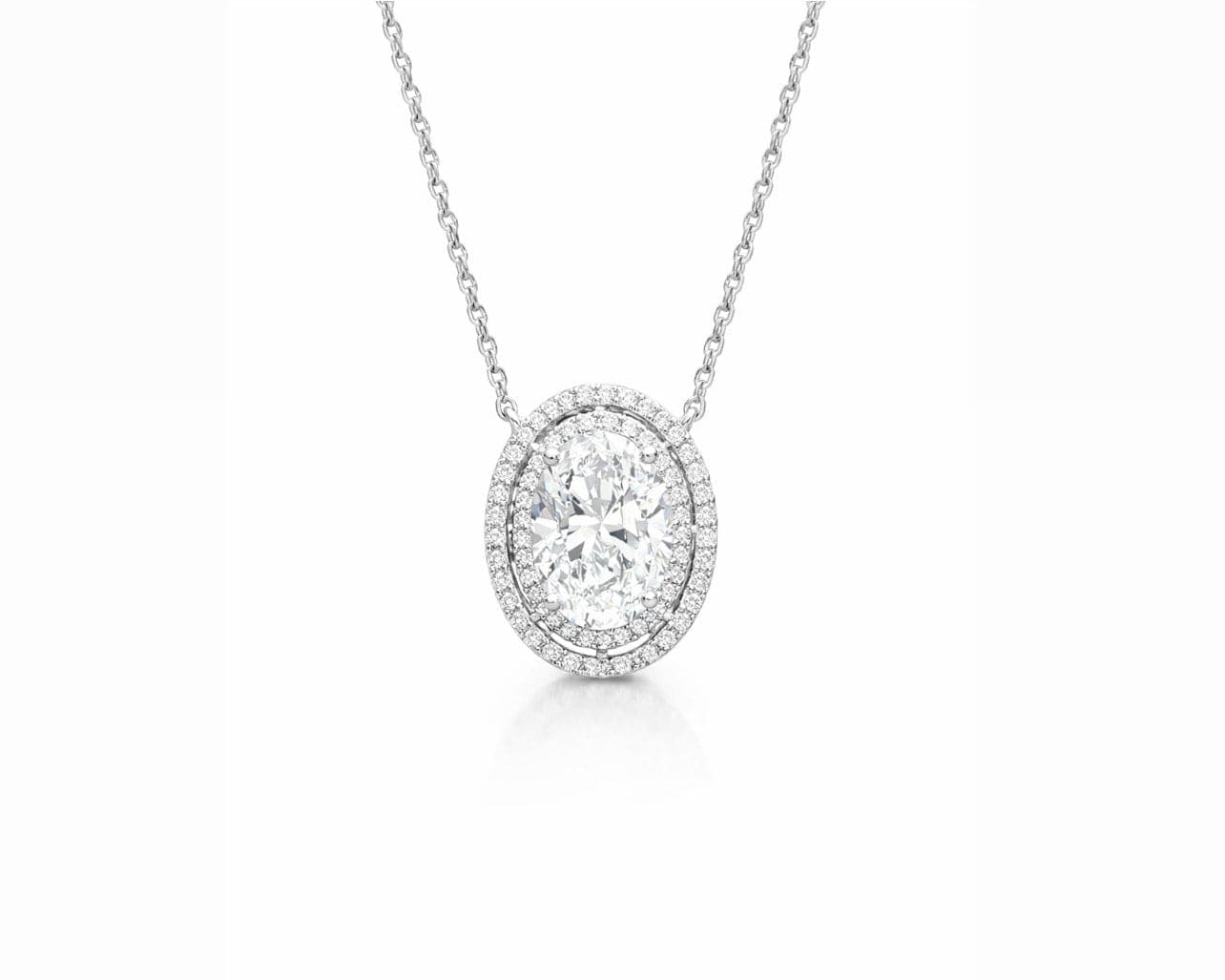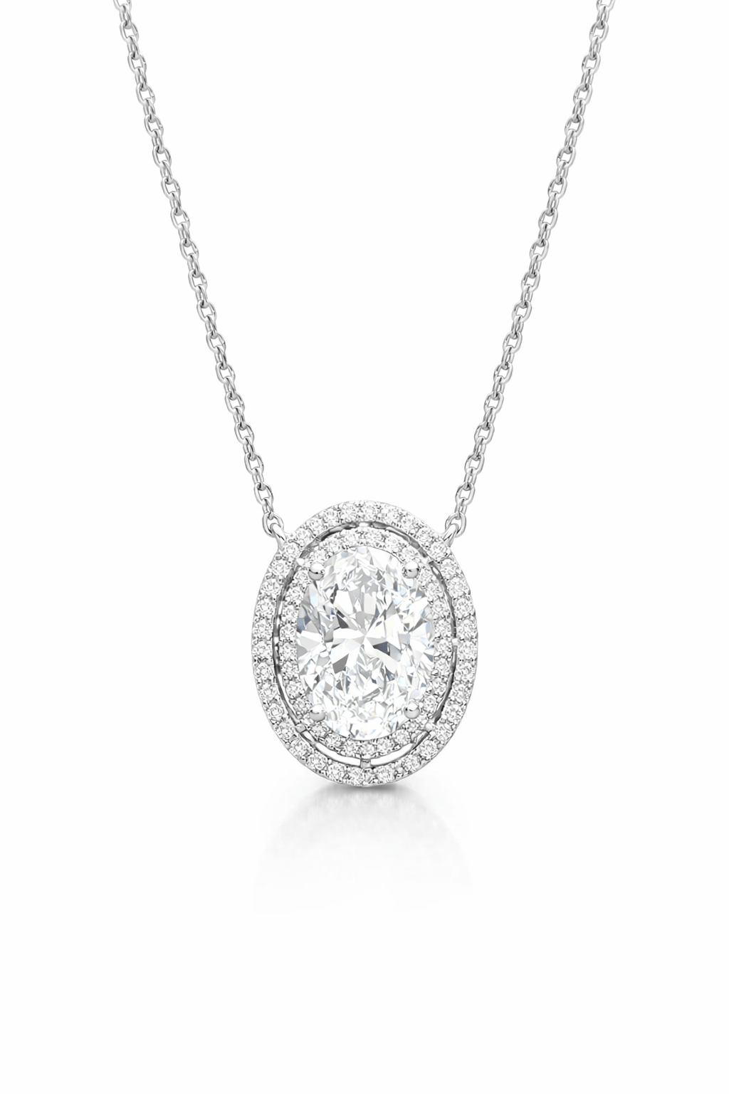 The Royale Oval Necklace is a statement of timeless elegance and refined brilliance. Featuring a radiant oval-cut diamond encircled by a delicate halo of shimmering stones, this pendant is designed to maximize light, fire, and sparkle from every angle. Suspended from a sleek, polished chain, the Royale Oval Necklace blends classic sophistication with modern luxury, perfect for both everyday wear and unforgettable occasions.