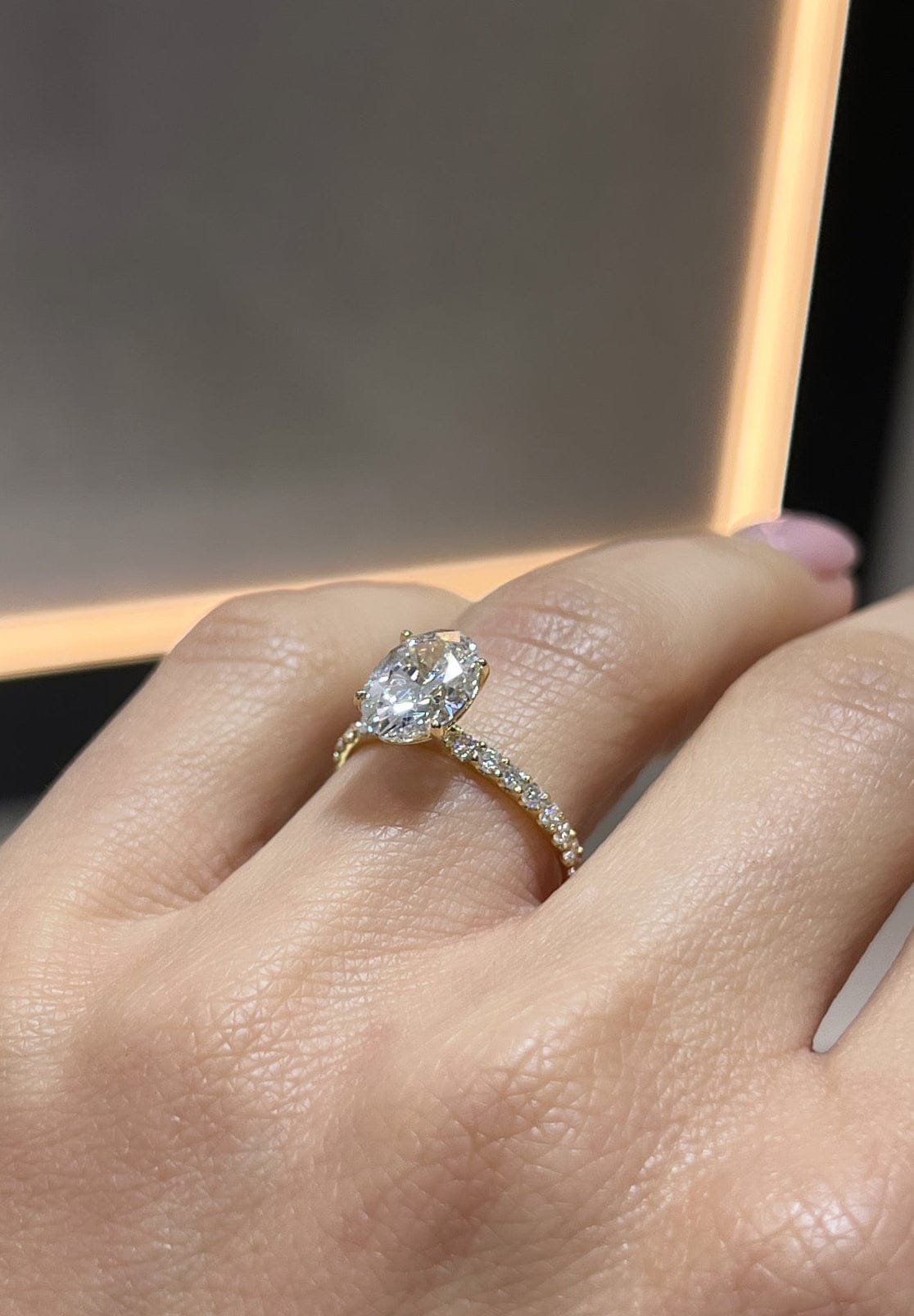 Set on a delicate diamond band, pavé-set stones add a continuous shimmer, perfectly complementing the center diamond without overpowering it. The result is a balanced design that feels both modern and classic.